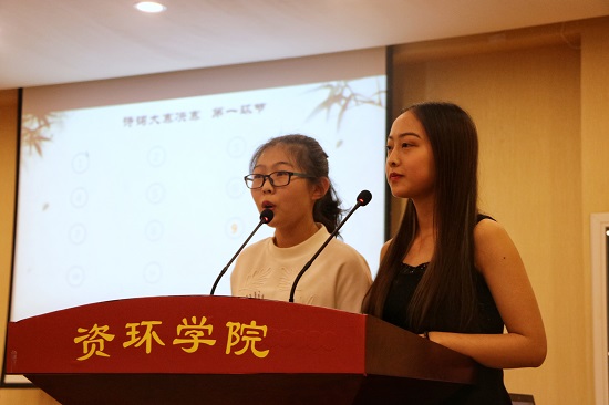 贵大资环网讯(新闻中心支升福报道|摄影卢利潇 曹梦瑶)朗朗的诗词声萦绕在资环楼,给夜里的资环楼增添了几分古风古韵。经历初赛激烈的角逐,2018年4月12日晚7点,资环学院“魅力资环诗词”迎来了总决赛,出席本次大赛的嘉宾有我院党委副书记徐进老师,学生科曹贞贞老师,陈成老师及漆晗老师,还有来自物理学院的王帅老师,文传学院的郭欣欣学姐和张春江学长,研究生会副主席韩志杰。决赛由裴悦、陈思宇同学主持。