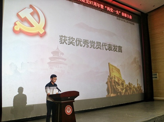 会议伊始,全体起立奏唱国歌。接着,研究生党总支书记綦娅同志带领全体党员宣誓。随后进行表彰大会,学院党委委员吴攀院长宣读资环学院“两优一先”表彰决定。他提到,学院各级党组织和全体共产党员在校党委的领导下,以习近平新时代中国特色社会主义思想为指导,自觉践行“三严三实”和“两学一做”,在学院各项工作中发挥了重要的战斗堡垒作用和先进模范作用,为展现学院共产党员的精神风貌,引导各级组织和广大党员,为学院的改革发展做出新的更大的贡献,同时希望全体党员以受到表彰的同志为榜样,坚持全心全意为人民服务的宗旨,不断的提高自身的思德修养和业务水平,爱岗敬业,无私奉献。之后由吴攀院长为优秀学生党员、教工优秀党员颁奖。周丕康副院长为学生优秀党务工作者颁奖,刘方副院长为教工优秀党务工作者颁奖,滕召华书记为先进基层党组织颁奖。
