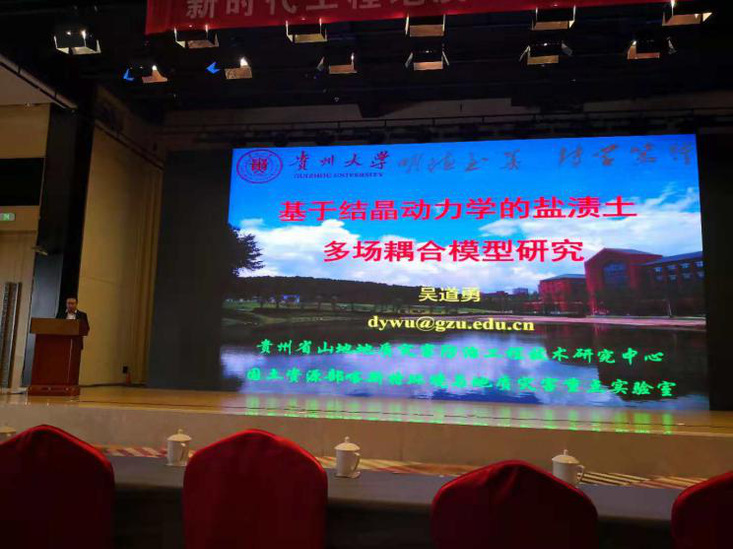 杨根兰副教授做了《贵州赤水丹霞地貌区工程边坡破坏机理分析》报告,通过室内物理模型试验、现场监测及数值模拟等研究方法,提出了仁赤高速中—厚层软硬互层岩体在陡立临空条件下的变形破坏机理。吴道勇老师做题为《基于结晶动力学的盐渍土多场耦合模型研究》的大会报告,将物理化学中相变理论引入盐渍土多物理场耦合研究中,提出了包含结晶相变的孔隙材料破坏准则。史文兵老师做了《贵州典型矿山地质灾害形成机制研究》的学术报告,以近年来贵州发生的几处大型矿山地质灾害为例,通过现场精细化调查、数值模拟及理论研究,总结出了典型矿山地质灾害发生的五个必要条件。鲁鲲鹏老师做了《弧形加载下砂岩圆盘试件声发射特征的研究》学术报告,分析了带弱面非均质岩体巴西劈裂试验过程的声发射响应。
