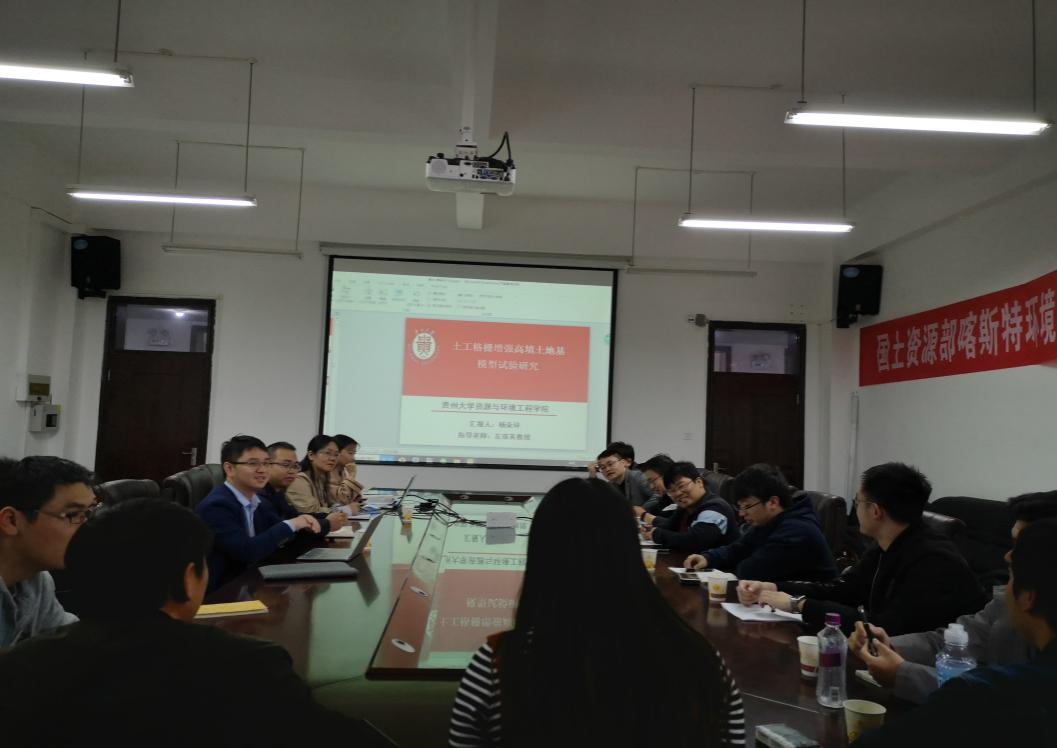 随后,喀斯特岩土力学团队研究生杨朵环同学进行项目进展汇报。报告中,杨朵环同学细心介绍了试验设计方案、加载步骤、数据采集与处理、结果分析等。省建院代表团对目前项目投入的工作量及所取得的研究成果表示了充分的肯定,双方就该课题室内模型试验与实际工程应用结合方面进行了深刻的技术交流与探讨,对下一步的研究内容进行了部署。