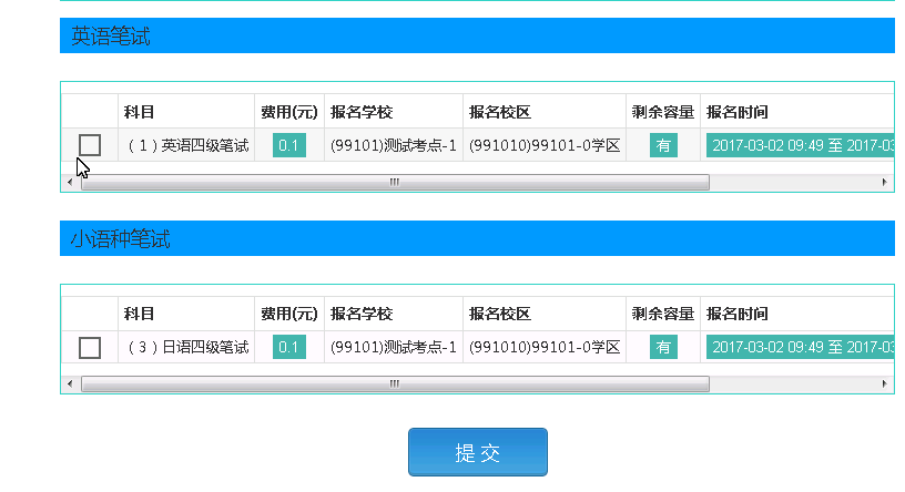 选择要报考的科目,点击“提交”按钮,返回到考生报名页面,点击“口试报考”
