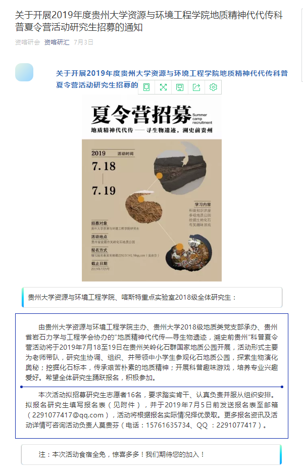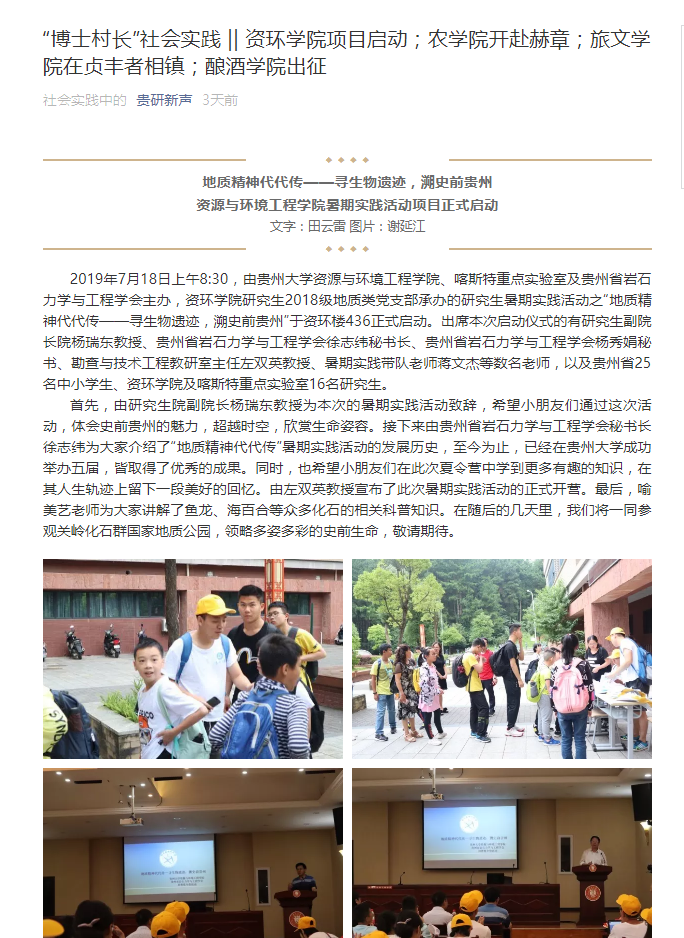 此次暑期社会实践活动由贵州大学资环学院&贵州大学地球科学实习科普基地与贵州省岩石力学与工程学会联合举办,活动情况在贵州省岩石力学与工程学会官网、贵研新声、资环学院官网等均有宣传,此外,活动获得老师、家长及参与学生一致好评。