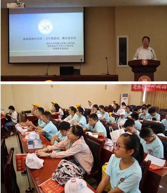 2019年7月18日早上8:00,yl6809永利官网暑期实践活动之“地质精神代代传—寻生物遗迹,溯史前贵州”暑期社会实践活动正式启动,贵州大学资环学院研究生院杨瑞东副院长,勘查与技术工程教研室主任左双英教授,古生物研究教授喻美艺、地质工程专业蒋文杰老师以及贵州省岩石力学与工程学会徐志纬秘书长、杨秀娟秘书出席开幕式并作重要讲话,活动负责人做流程讲解,成员自我介绍,喻美艺老师为大家进行了关于化石的科普知识讲座,深入浅出地讲解了生物化石的科普知识,简述了化石与生物遗迹的区别,并对关岭国家地质公园里面的海龙以及鱼龙,海百合等作了简单介绍,激发了小朋友们的进一步的兴趣。揭开了此次活动的序幕。