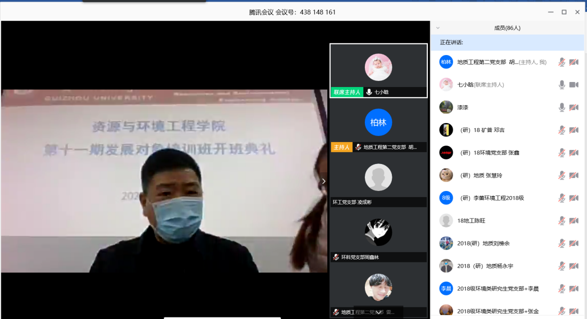 滕召华书记致辞,他强调这是一次特别的开班仪式,希望全体学员居家学习期间,要坚持学习习近平新时代中国特色社会主义思想,坚定理想信念,强化政治素质,端正学习态度,发扬优良的学习作风。他要求全体学员要珍惜本次党校学习机会,必须严格要求自己,用心、深入地学习党的理论知识,坚持学以致用,进一步巩固提高对党的认识,树立集体荣誉感,增强社会责任心,同时预祝学员们能够早日加入中国共产党。最后,漆晗老师对培训班作纪律要求,要求学员在学习期间自觉遵守培训班纪律,不得无故旷课早退,认真做好学习笔记,撰写心得体会,并公布后续的学习安排及相关事宜。