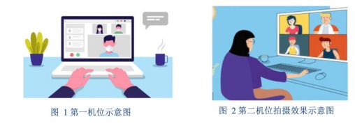 考生需要准备可以支撑“双机位”运行的硬件,即需要两部带摄像头的设备及附件,第一机位可以是电脑或手机,第二机位只能为手机(建议第一机位首选有线网+电脑)。一台设备(第一机位)从正面拍摄,放置在距离本人30cm处,另一台设备(第二机位)从考生侧后方45°距离本人30cm处拍摄,确保第一机位和第二机位分别从考生面前和身后完整拍摄到考生全身,复试组考官能够从第二机位清晰看到第一机位屏幕。效果图如下: