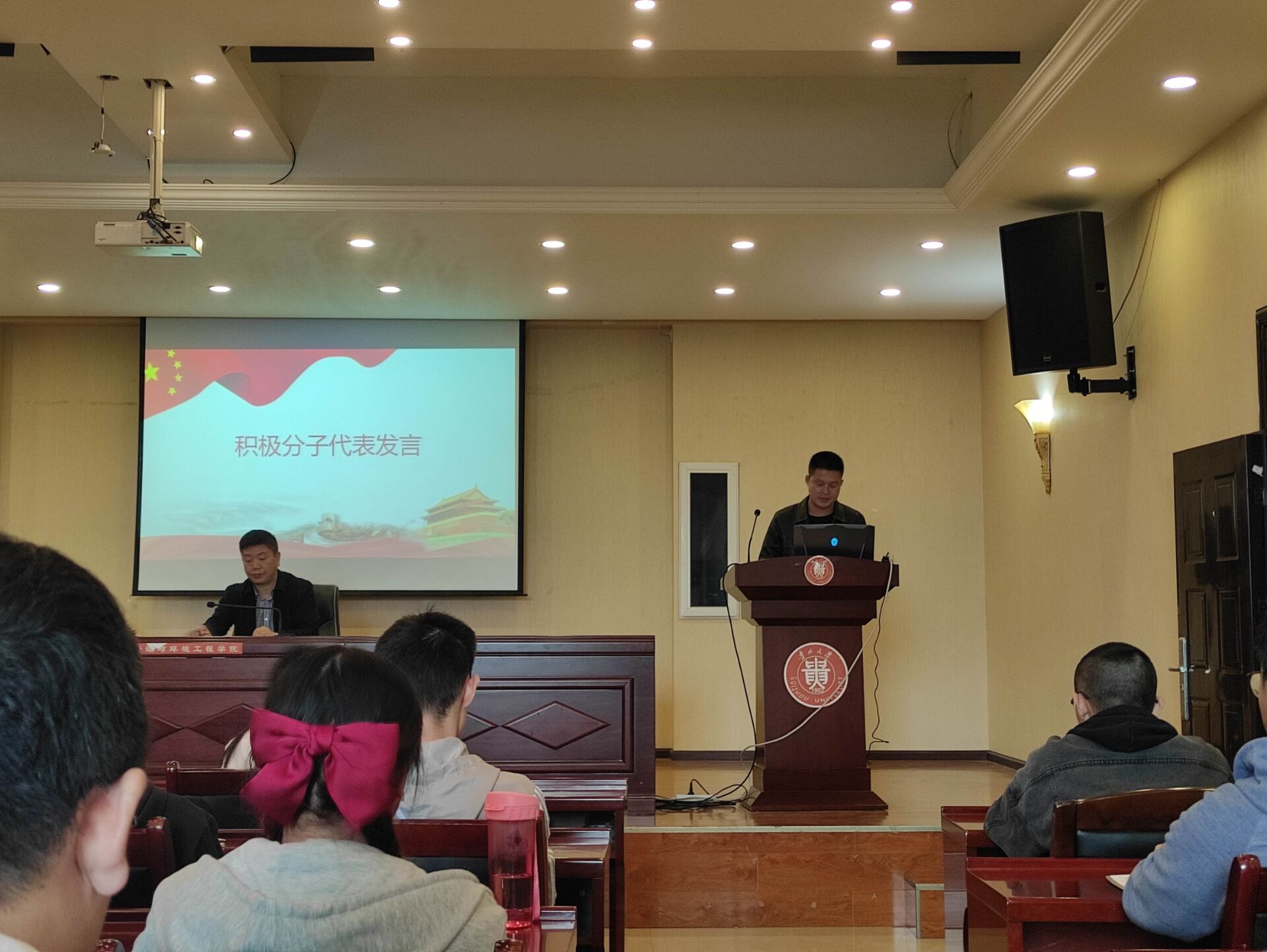 学员代表白国前发言,他表示,感谢学校、学院提供这个学习、成长的机会,我们将以积极、认真、严肃的态度对待此次学习,认真听好每一节课,做好课堂笔记,坚定理想信念,时刻准备着接受党组织的考验,以实际行动争取早日加入中国共产党。