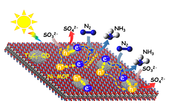 针对上述关键科学问题,刘宝军副教授课题组通过精准调控具有高密度金属节点和丰富不饱和金属位点的超薄二维金属有机骨架(2D-MOFs)纳米片负载具有各向异性的MXene量子点(Ti3C2-QD),形成了0D/2D MXene-QD/Ni-MOF多重微结功能化材料,系统开展了低维纳米功能化材料的结构形态在太阳能驱动下合成氨效率研究,并利用多种原位在线监测手段和DFT计算方法提取材料表界面与反应过程信息,从分子层面上探究N2在材料表界面反应过程的微观机制,创造性地提出低维纳米功能化材料的结构特性与反应性能间的构效关系。