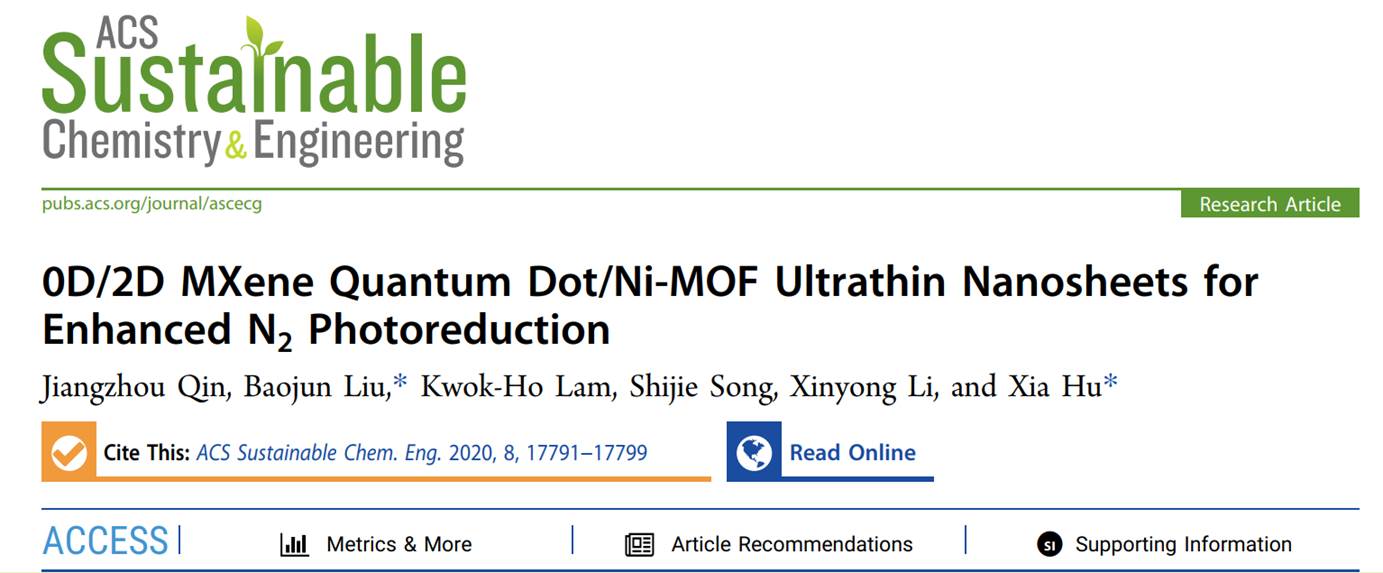 该研究成果以“0D/2D MXene Quantum Dot/Ni-MOF Ultrathin Nanosheets for Enhanced N2 Photoreduction”为题在线发表于环境与化工领域一区Top期刊ACS Sustainable Chemistry & Engineering(IF = 7.632)。2017级硕士研究生秦疆洲为该论文第一作者,刘宝军副教授和胡霞副教授为通讯作者。该论文是在刘宝军副教授和胡霞副教授的共同指导下完成的。合作者包括香港理工大学工学院Kwok-Ho Lam教授、大连理工大学环境学院李新勇教授,以及西安科技大学地环学院的宋世杰教授。本研究得到了国家自然基金(No. 21703044)等项目的资助。