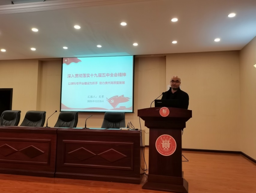 吴攀副校长在学院政治学习会议上,为全院教工做“深入贯彻落实十九届五中全会精神:以学科与平台建设为抓手 助力贵州高质量发展”的主题宣讲,号召学院全体教职工聚焦贵州省高质量绿色发展态势,继续做好学院学科平台建设工作,并对学院发展的战略思考和当前重点工作提出指导性意见。