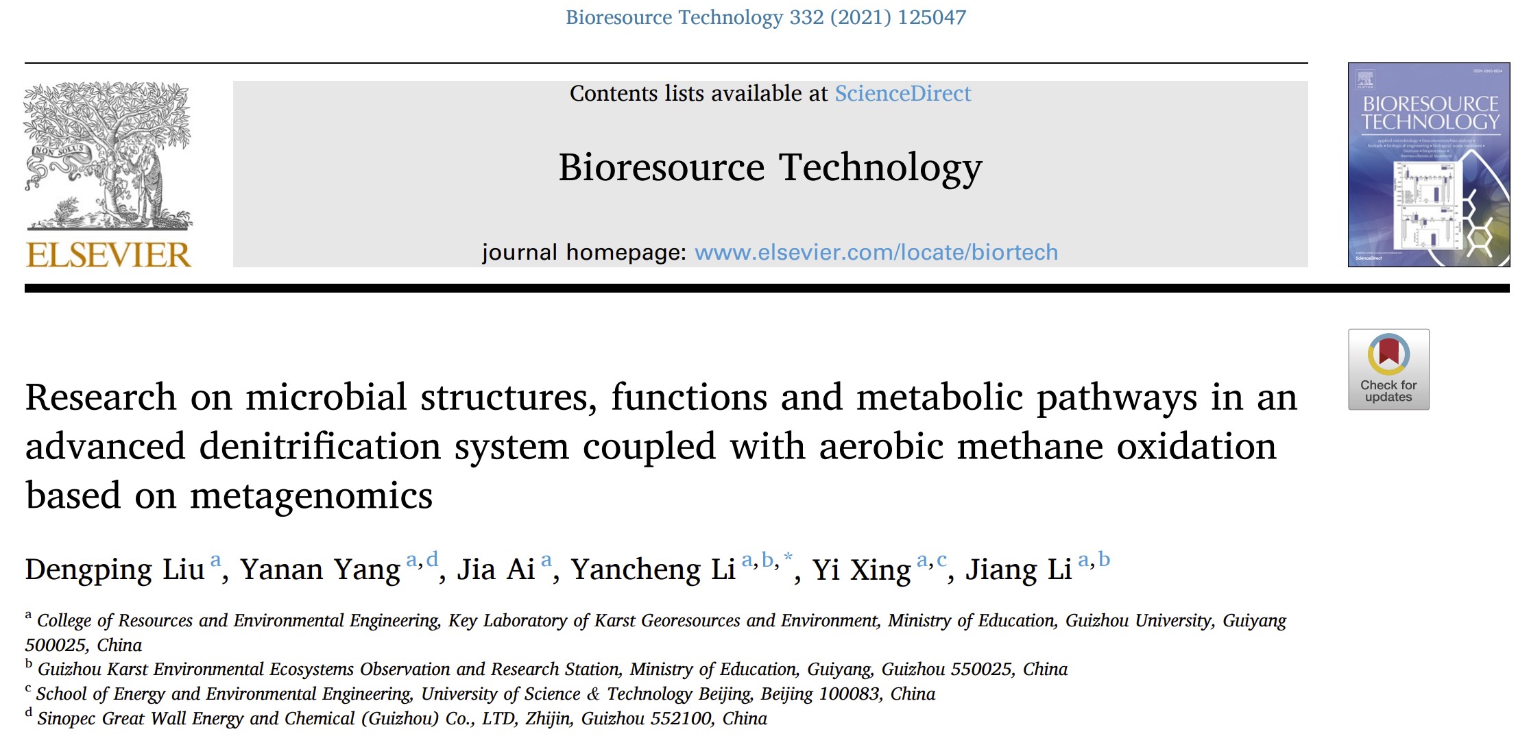 甲烷氧化菌能够利用甲烷作为唯一碳源和能源,在氧化甲烷过程中产生的中间产物够被共存的反硝化菌利用从而实现氮的去除,这一过程被称为好氧甲烷氧化耦合反硝化(AME-D),此外,AME-D也能够减少温室气体的排放。近日,环境领域国际知名期刊Bioresource Technology 在线发表了我院环境工程专业刘邓平和杨娅男同学关于好氧甲烷氧化耦合反硝化(AME-D)深度脱氮的研究进展。