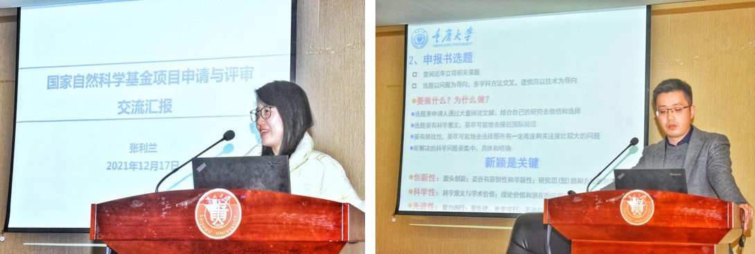 2021年12月17日,重庆大学张利兰副教授和陈一教授应邀访问我院并作国家自然基金申报经验交流报告。参加会议的有学院党委书记滕召华、副院长付勇教授及学校学院70余位老师和同学,会议由副院长付勇教授主持。