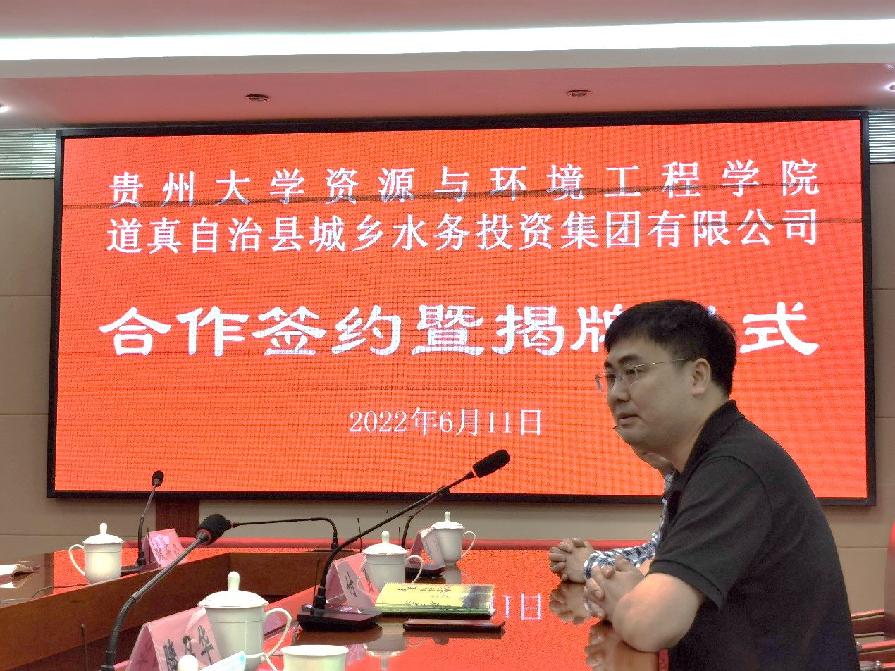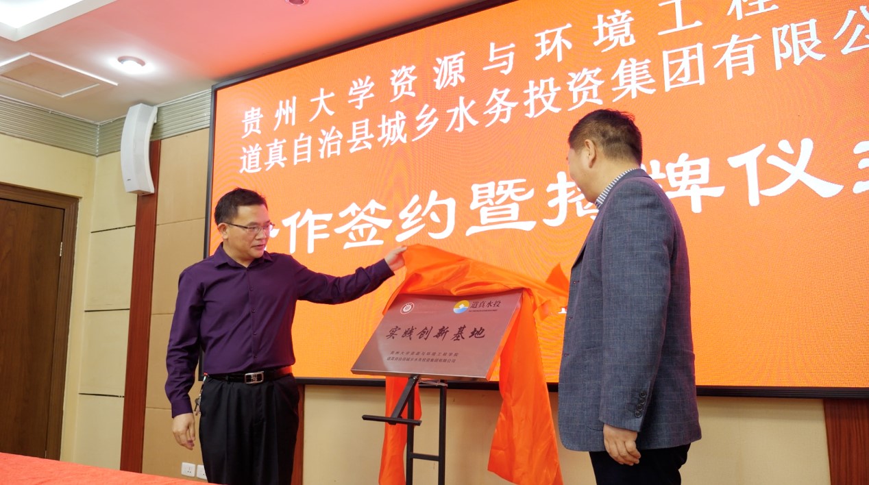2022年6月11日,贵州大学资环学院与道真水投集团签署合作协议,双方以习近平新时代中国特色社会主义思想为指导,以平等互利、优势互补、相互协作、资源共享、共同发展为原则,发挥各自的优势,围绕县乡供排水一体化、生态环境治理,拟在“基础科学研究、科学技术开发、专业技术人才培养、科普宣传”等方面开展合作。道真水投集团将为贵州大学学生提供实习实践基地,为教师提供科研试验示范平台,助推贵州大学创新创业教育实践和科学研究及社会服务高质量发展。签约仪式后,双方为“实践创新基地”揭牌。