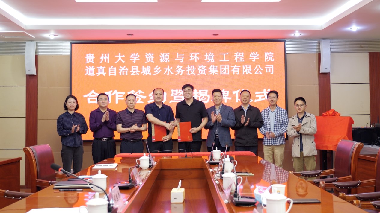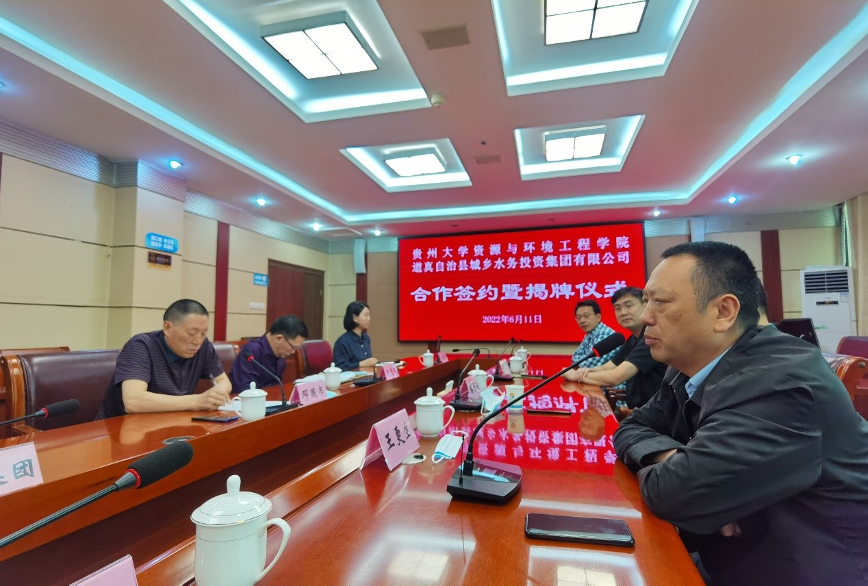 2022年6月11日,贵州大学资环学院与道真水投集团签署合作协议,双方以习近平新时代中国特色社会主义思想为指导,以平等互利、优势互补、相互协作、资源共享、共同发展为原则,发挥各自的优势,围绕县乡供排水一体化、生态环境治理,拟在“基础科学研究、科学技术开发、专业技术人才培养、科普宣传”等方面开展合作。道真水投集团将为贵州大学学生提供实习实践基地,为教师提供科研试验示范平台,助推贵州大学创新创业教育实践和科学研究及社会服务高质量发展。签约仪式后,双方为“实践创新基地”揭牌。