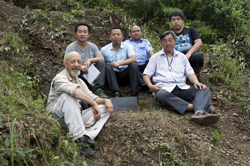 图7 2018年8月18日,杨宇宁副教授(左二)与时任寒武系分会主席、美国俄亥俄州立大学Loren E. Babcock教授(左一)在寒武系苗岭统和乌溜阶“金钉子”剖面接受媒体现场采访