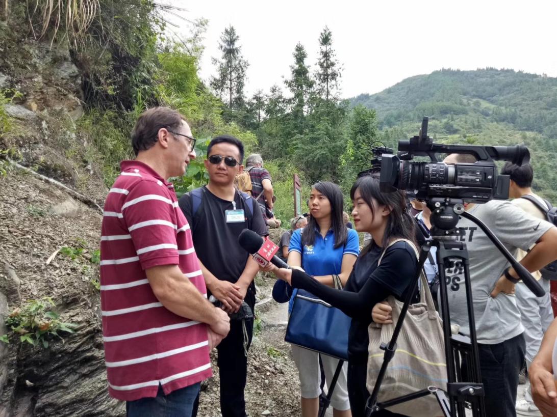 2018年8月,国际埃迪卡拉系-寒武系科学大会贵州野外考察会议如期举行,杨宇宁作为本次国际野外会议的负责人之一,起草了会议手册和会议日程,协调大会各项事宜,并且用英文讲解野外地质内容,接受新闻媒体采访等(图7、8),与研究团体成员赵元龙教授、彭进教授和杨兴莲教授等一起把贵州寒武系乌溜阶“金钉子”等研究成果向国内外30多位专家学者以及新闻媒体进行了系统介绍和展示,提高了贵州首枚“金钉子”的国际影响力和社会普及度。