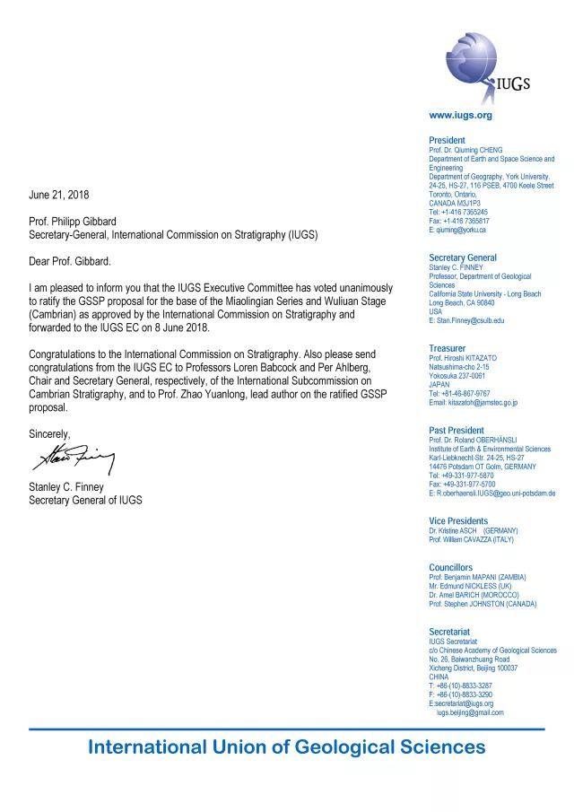 图5 2018年6月21日,国际地科联正式签署寒武系苗岭统和乌溜阶“金钉子”的批文