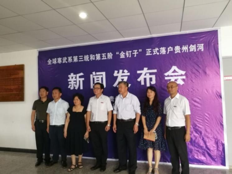图6 2018年7月5日,贵州大学召开全球寒武系第三统和第五阶“金钉子”正式落户贵州剑河的新闻发布会,学校、学院领导与研究团队成员合影(左起:时任资环学院党委书记滕召华老师、杨宇宁副教授、彭进教授、贵州大学党委书记李建军教授、赵元龙教授、杨兴莲教授、时任资环学院院长吴攀教授)