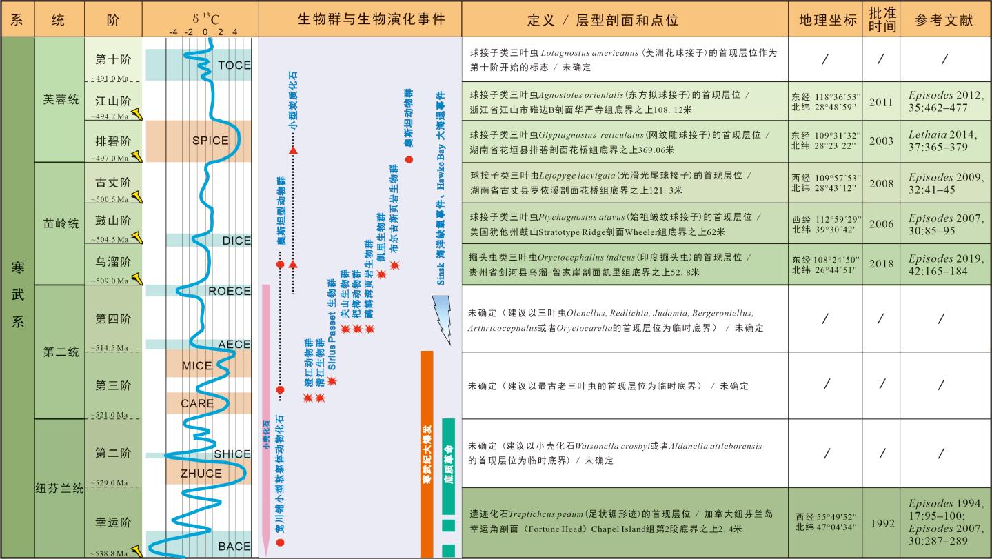 图2 寒武系年代地层划分与“金钉子”(GSSP)、寒武纪重要生物群产出层位、重要地质和生物事件