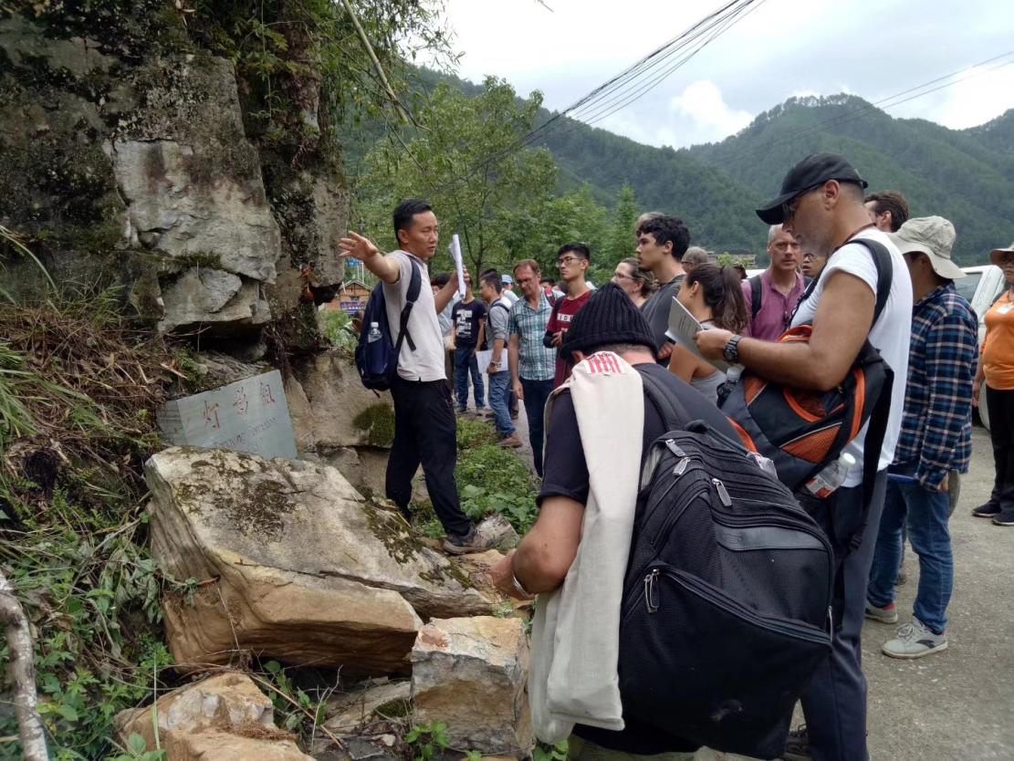 图8 2018年8月18日,杨宇宁副教授(左一)在剑河县五河剖面给国际埃迪卡拉系-寒武系科学大会的与会代表讲解地层序列