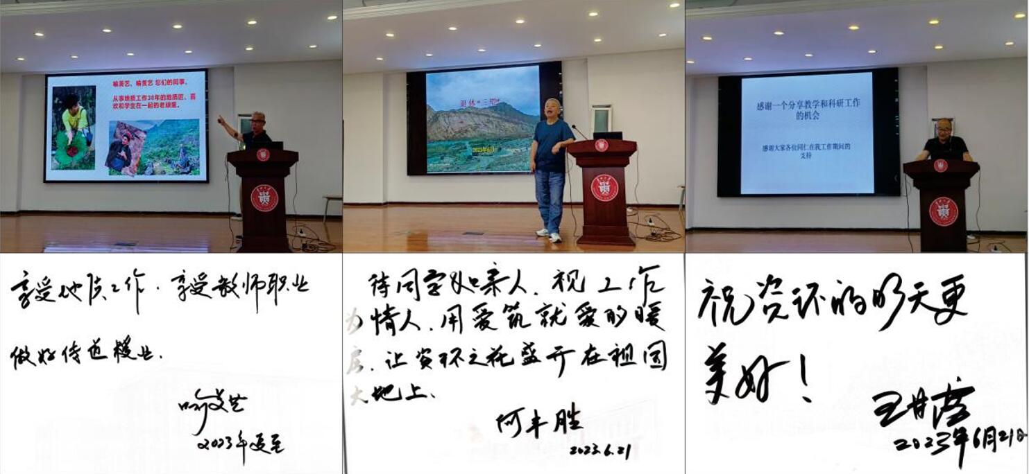 荣退仪式上,喻美艺、何丰胜、王甘露三位老师分别以《从事地质工作38年的地质匠、喜欢和学生在一起的老顽童》、《退休三望》、《教学和科研经验分享》为题,深情回忆了他们工作期间的点点滴滴,分享了他们在教学、科研方面的好经验、好做法,并对年轻一代提出了殷切希望和祝福。希望后人们能够继续秉持传统,不断改革创新,充分发挥专业和团队优势,努力在地学领域作出新业绩,博出一个新前程。希望老师们能够立足本职,坚守底线,享受职业,做一个让学院放心、学生们喜爱的新时代合格好老师。同时对学院和同事们在其职业生涯过程中给予的支持、鼓励和帮助表达了谢意。最后,他们分别在荣休留言册上写下了深深的祝福语以及对学院和老师们的寄托与期望。