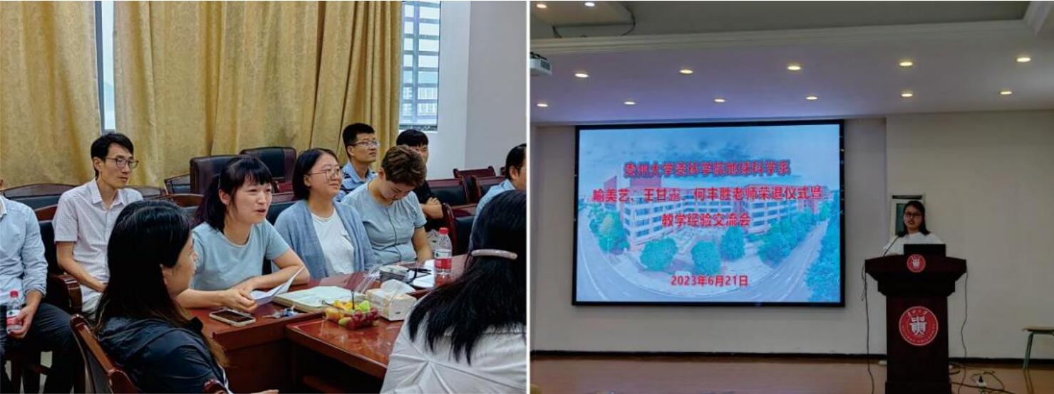 喻美艺、何丰胜、王甘露(从左至右)老师分享教学、科研经验并在荣休留言册留言