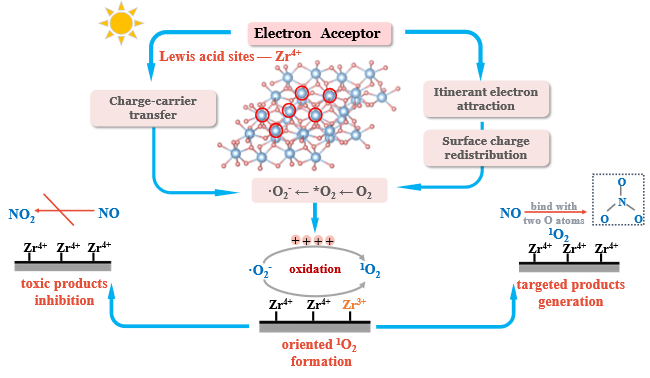 低浓度NOx作为重要前体物参与气溶胶和臭氧形成,导致当前大气环境问题。光催化技术可在温和条件下直接利用太阳光生成活性氧物种(ROS),将NOx氧化去除,但光催化氧化NOx过程中会产生毒副产物NO2,如何促进NO深度氧化仍是该领域的难题。该研究工作运用“水辅助相变”的方法调控ZrO2表面路易斯酸位点数量,通过可控的表面酸位点优化光催化剂表面电子结构,诱导单线态氧(1O2)定向生成,利用该具有未占据π轨道的1O2促进存在孤对电子的NO选择性氧化,最优样品具备良好的NO转化率(56.33%)和极低的NO2选择性(5.04%),实现高效深度氧化NO的同时有效抑制毒副产物NO2生成,保证提升污染物净化效率与降低环境风险之间的平衡。此外,该研究运用ROS原位猝灭实验、原位红外光谱(in situ DRIFTS)、结合了ROS猝灭方法的in situ DRIFTS和密度泛函理论(DFT)模拟计算方法,阐明路易斯酸位点调节与1O2生成之间的关系,明确反应物、中间产物、终产物以及反应活性物种的生成和演变规律,揭示光催化氧化NO反应机理及其性能提升机制。该研究可为ROS定向调控策略提供参考、为发展高效安全的光催化NO氧化技术提供新思路。