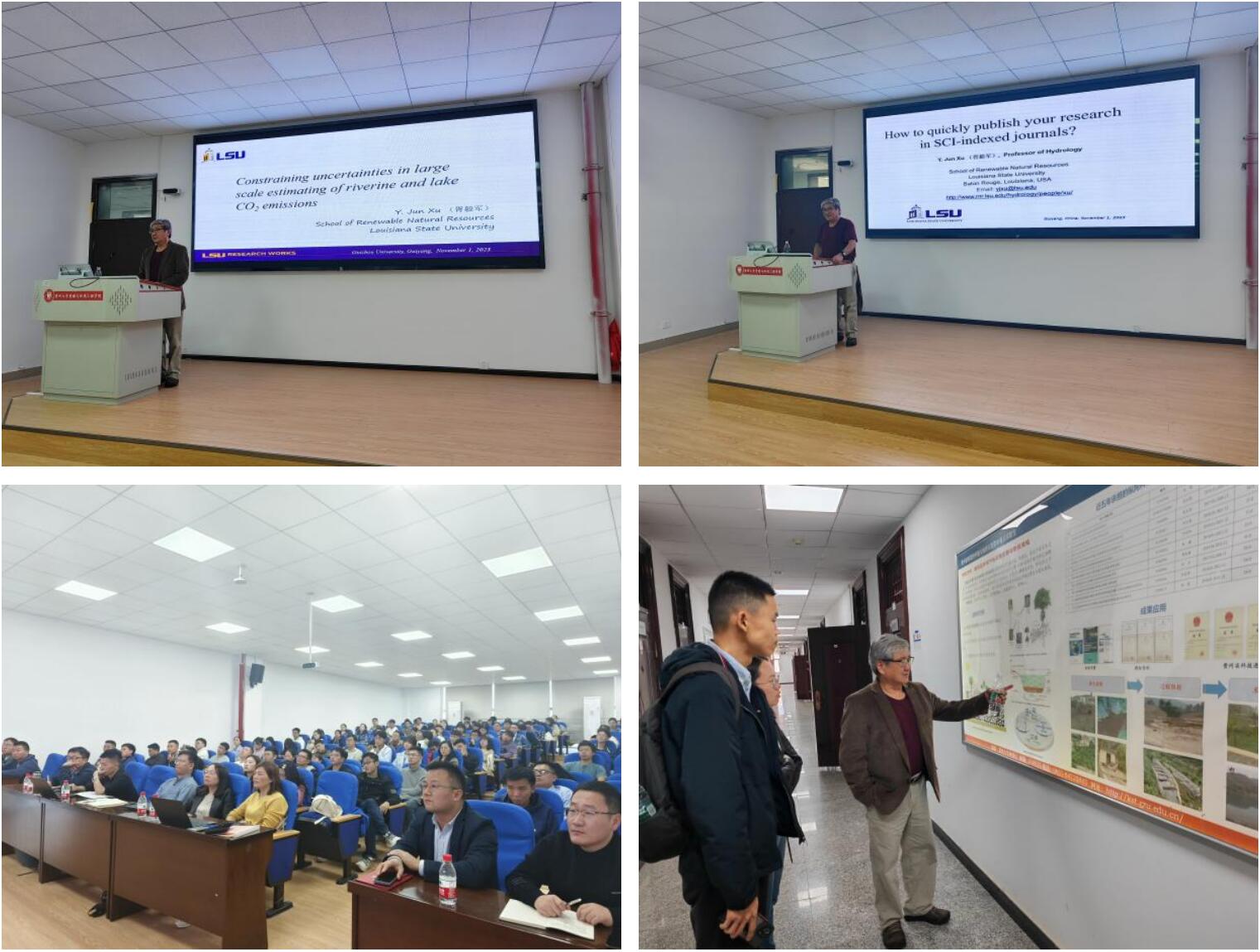 111日,受我院地球科学系曹星星副教授邀请,美国路易斯安那州立大学Y. Jun Xu(胥毅军)教授来我院和重点实验室进行学术交流。胥毅军教授研究领域为自然或人为活动干扰背景下的河流水文和生物地球化学过程,水文学方面,主要关注流域和江河流域尺度建模、河流泥沙输运、河流地貌学以及 RS/GIS 在地表水环境体系中的应用;在生物地球化学方面,主要涉及河流和湖泊中的元素迁移、水质变化和养分循环。现任《Water》水文学方向主编,《Journal of Solis and Sediments》副主编,《Soil and Water Research》和《湿地科学》编委在美国水文学会集水区委员会,国际大陆侵蚀与泥沙委员会等多个国际学术组织机构中任职,多次主持召开国际水文会议和参加美国国家自然基金首席专家评审组会议已发表SCI学术论文两百余篇