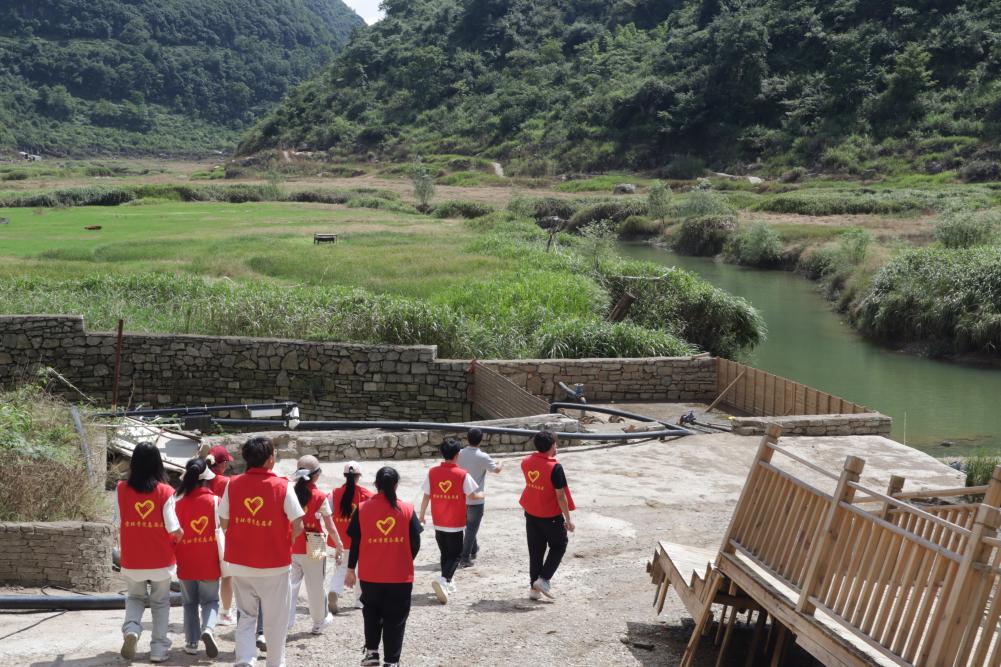 飞龙谷是喀斯特地区典型的盲谷,实践队在飞龙谷沿出露河段进行水文地质考察,在陈世万老师的带领下对该外地水文地质条件进行了分析。该谷地汇水面积大、排水暗河入口单一,易形成内涝。但因其封闭地貌特征,可作为水库建设的良好用地。实践队员与负责疏通暗河的施工人员沟通交流,了解到洼地主要排水暗河由于堵塞导致洼地内涝,目前正在疏通施工中。